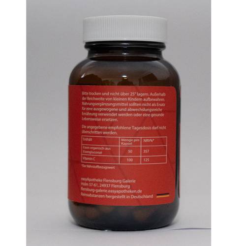 - Hochdosiert: 50 mg Eisen + 100 mg Vitamin C pro Kapsel