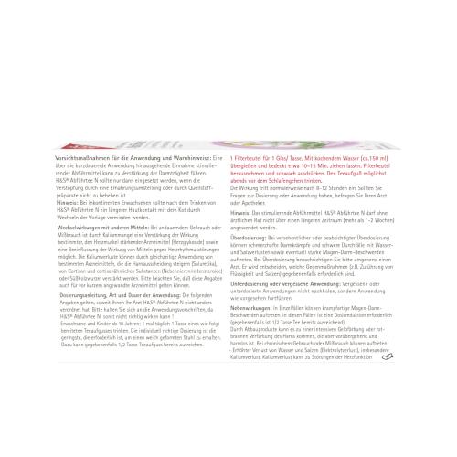 Dosierungsanleitung, Art und Dauer der Anwendung: Die folgenden Angaben gelten, soweit Ihnen Ihr Arzt H&S® Abführtee N nicht anders verordnet hat. Bitte halten Sie sich an die Anwendungsvorschriften, da H&S® Abführtee N sonst nicht richtig wirken kann !Erwachsene und Kinder ab 10 Jahren 1 mal täglich 1 Tasse eines wie folgt bereiteten Teeaufgusses trinken. Die individuell richtige Dosierung ist die geringste, die erforderlich ist, um einen weich geformten Stuhl zu erhalten. 1 Filterbeutel für 1 Glas/ Tasse (ca.150 ml). Mit kochendem Wasser übergießen und bedeckt etwa 10-15 Min. ziehen lassen. Filterbeutel herausnehmen und schwach ausdrücken. Den Teeaufguß möglichst abends vor dem Schlafengehen trinken. Die Wirkung tritt normalerweise nach 8-12 Stunden ein. Sollten Sie Fragen zur Dosierung oder Anwendung haben, befragen Sie Ihren Arzt oder Apotheker.Hinweis: Das stimulierende Abführmittel H&S® Abführtee N darf ohne ärztlichen Rat nicht über einen längeren Zeitraum (mehr als 1-2 Wochen) angewendet werden.