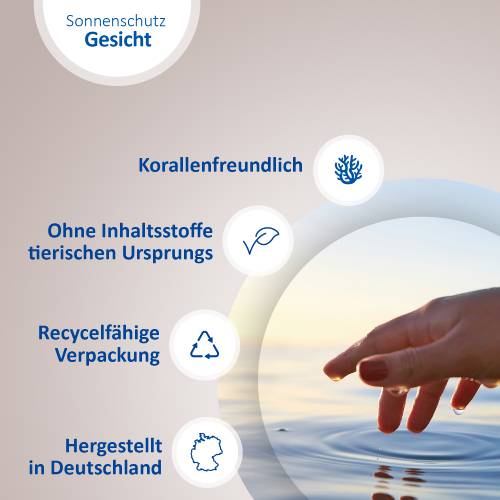 Tragen Sie die Sonnenschutz-Creme großzügig auf das Gesicht, den Hals, das Dekolleté und die Hände auf. Vor dem Auftrag von Make-Up oder anderen Gesichtsprodukten gut einziehen lassen. Cremen Sie nach Bedarf nach – vor allem nach dem Baden oder Schwitzen. Zu wenig Sonnenschutzmittel verringert den Lichtschutzfaktor.