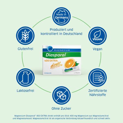 Die Produkte der Diasporal® EXTRA-KLASSE sind hochdosiert. Ein Stick pro Tag versorgt den Körper mit 400 mg Magnesium und trägt zur Deckung eines erhöhten Bedarfs bei.