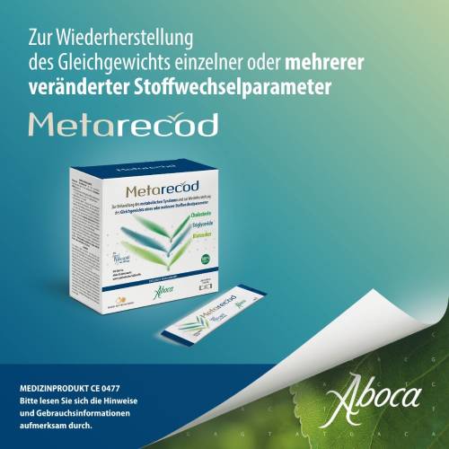 Metarecod wirkt dank NeoPolicaptil Gel Retard® auf den Darm durch die Bildung eines hochviskosen Gels. Metarecod ist ein Medizinprodukt für die systemische Kontrolle eines oder mehrerer veränderter Stoffwechselparameter, wie Cholesterin, Triglyceride und Blutzucker bis hin zum metabolischen Syndrom. Darüber hinaus schränkt NeoPolicaptil Gel Retard® die Fettaufnahme ein, reduziert die Blutzuckerspitzen und fördert die physiologische Zusammensetzung des Mikrobioms.