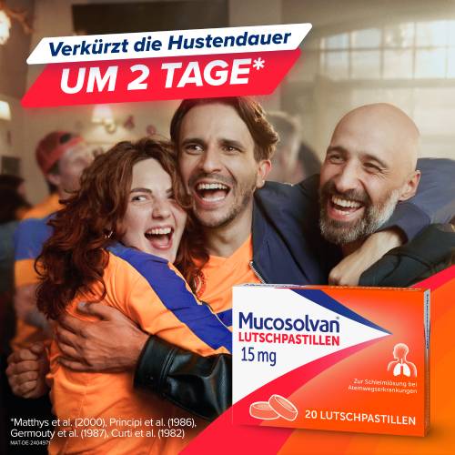 Mucosolvan® Lutschpastillen 15 mg. Wirkstoff: Ambroxolhydrochlorid. Anwendungsgebiet: Zur Schleim lösenden Behandlung bei akuten und chronischen Erkrankungen der Bronchien und der Lunge mit zähem Schleim. Warnhinweis: Enthält Sorbitol, Maltitol, Pfefferminzöl und Eukalyptusöl. Apothekenpflichtig.