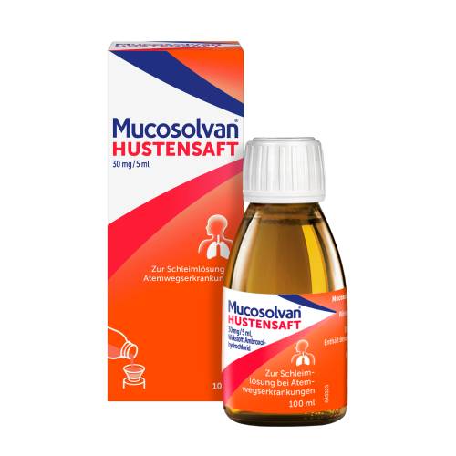 Mucosolvan Hustensaft 30 mg/5 ml. Wirkstoff: Ambroxolhydrochlorid. Anwendungsgebiet: Zur Schleim lösenden Behandlung bei akuten und chronischen Erkrankungen der Bronchien und der Lunge mit zähem Schleim. Warnhinweis: Enthält Benzoesäure und Propylenglycol. Apothekenpflichtig.