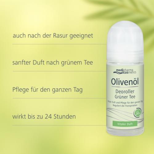 Der Olivenöl Deoroller Grüner Tee von medipharma cosmetics vereint Deo-Schutz mit sanfter Pflege. Die milde Formulierung mit kaltgepresstem Olivenöl schützt zuverlässig vor Körpergeruch und sorgt für ein angenehm frisches Hautgefühl – bis zu 24 Stunden. Gleichzeitig wird die Transpiration reguliert, ohne die natürliche Hautbalance zu beeinträchtigen.