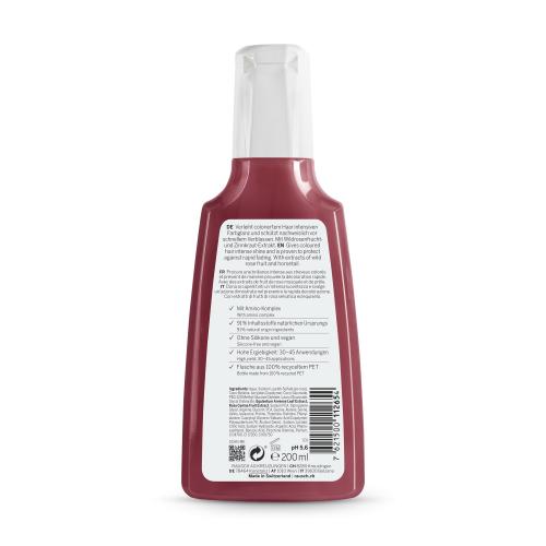 Das Farbschutz-Shampoo mit Wildrose ist sehr ergiebig. Eine Flasche reicht je nach Haarlänge für 30 – 45 Anwendungen. Die Formulierung besteht zu 91 % aus Inhaltsstoffen natürlichen Ursprungs, ist vegan und silikonfrei. Die Extrakte werden im hauseigenen Extraktionsverfahren in Kreuzlingen in der Schweiz hergestellt. Hier wird auch das Shampoo entwickelt und produziert.