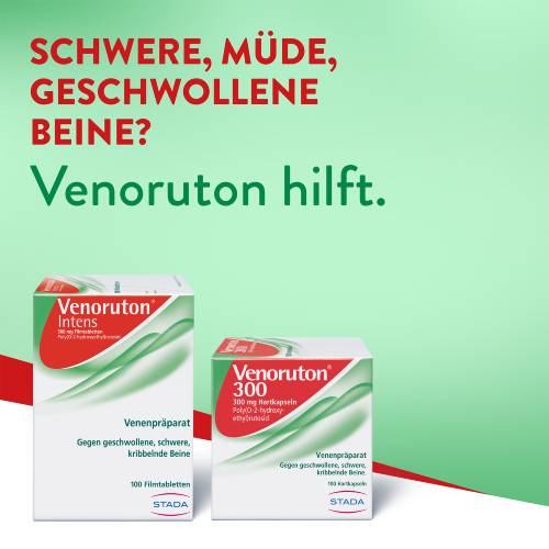 Venoruton hat die Lösung. Bei chronischen Venenleiden bietet Venoruton Intens gezielte medizinische Hilfe. Durch den veredelten Naturwirkstoff Oxerutin wird die erhöhte Durchlässigkeit der geschwächten Venenwände reguliert, wodurch weniger Wasser in das umliegende Gewebe austreten kann (Ödeme). Zusätzlich wir die Durchblutung gefödert und dadurch auch die Versorgung des umliegenden Gewebes verbessert. Die Beschwerden werden spürbar gelindert und einer Verschlimmerung wird von innen vorgebeugt.